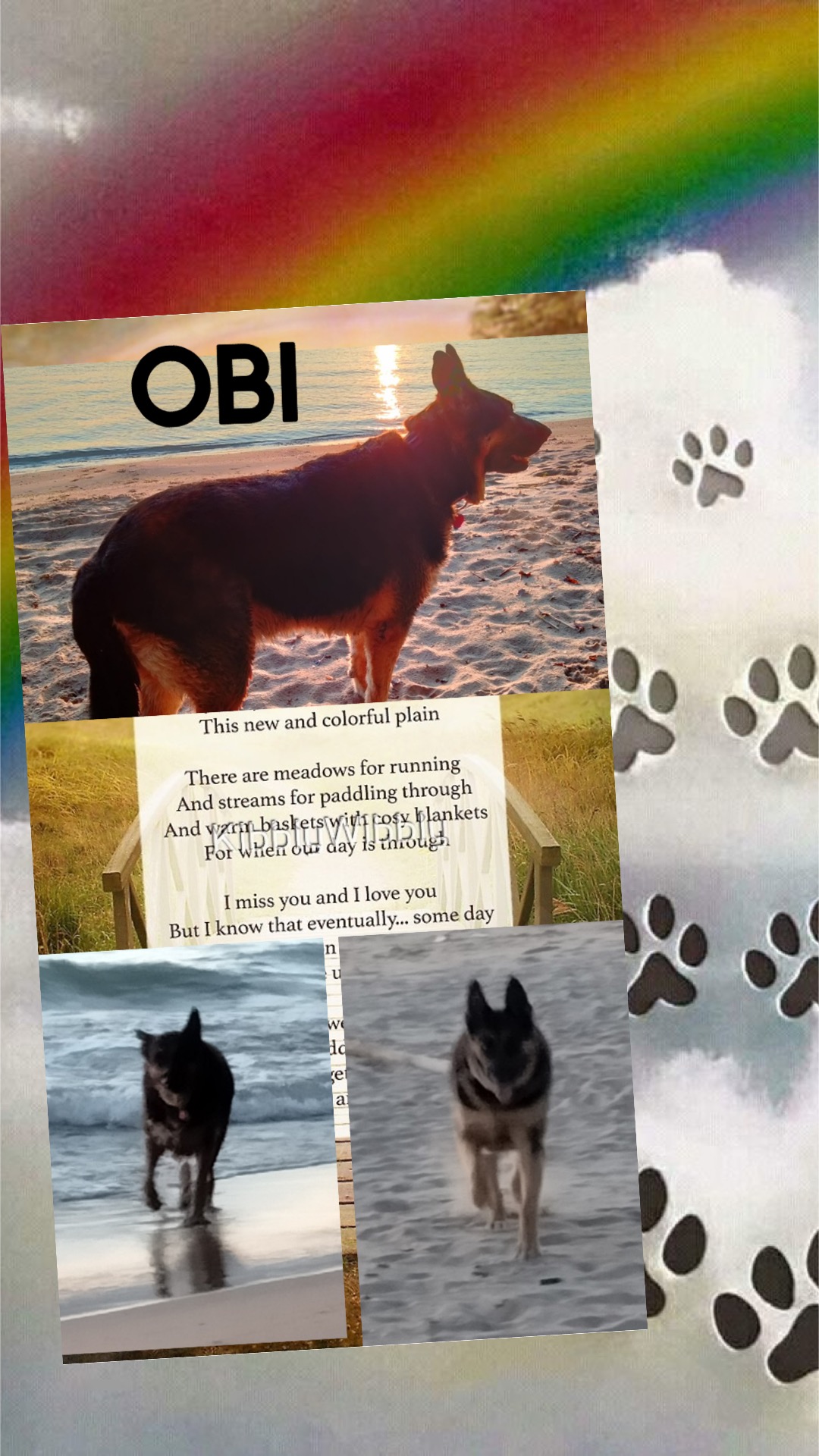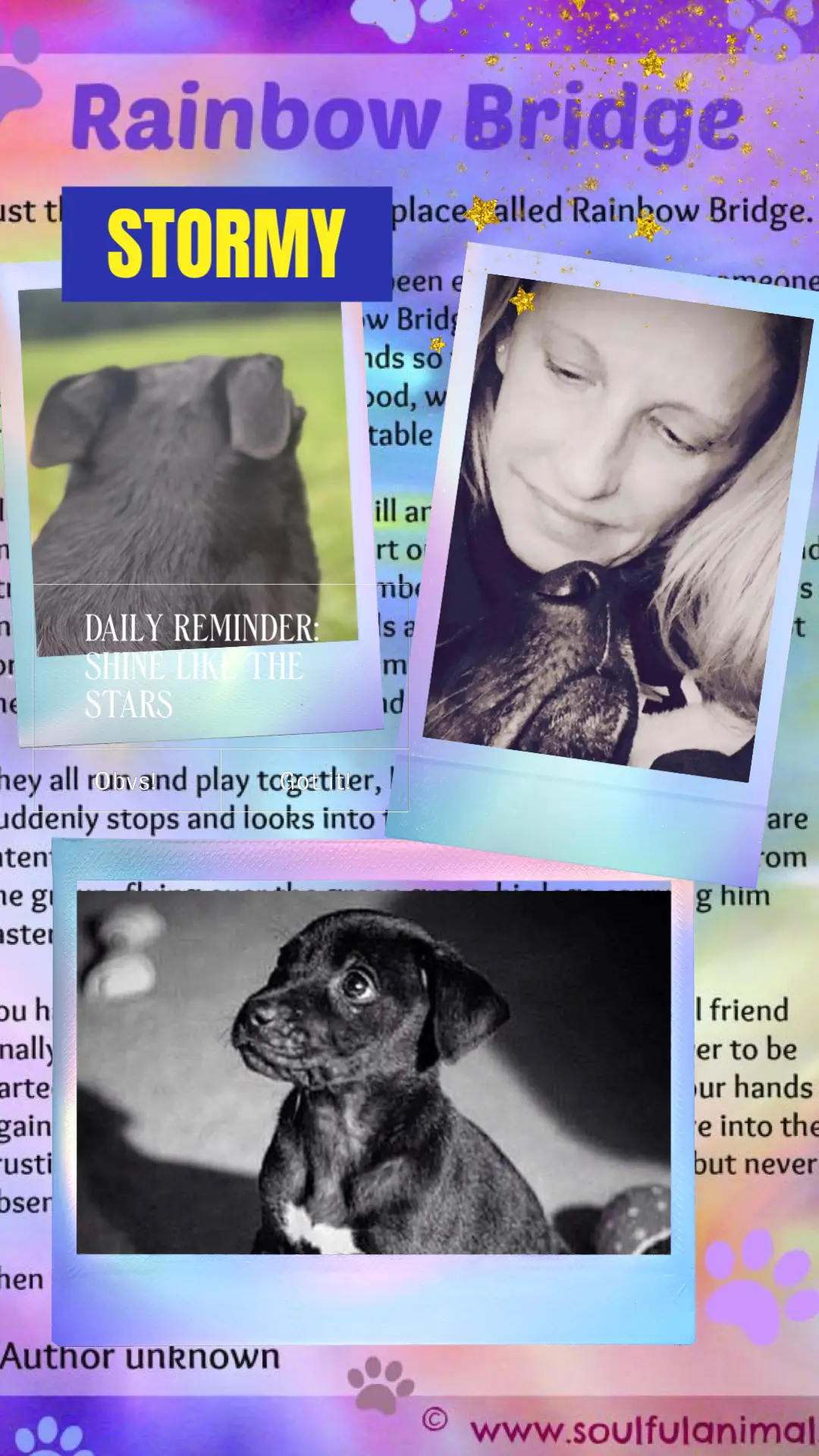 The old and frail animals are young again. Those who are maimed are made whole again. They play all day with each other. There is only one thing missing. They are not with their special person who loved them on earth.