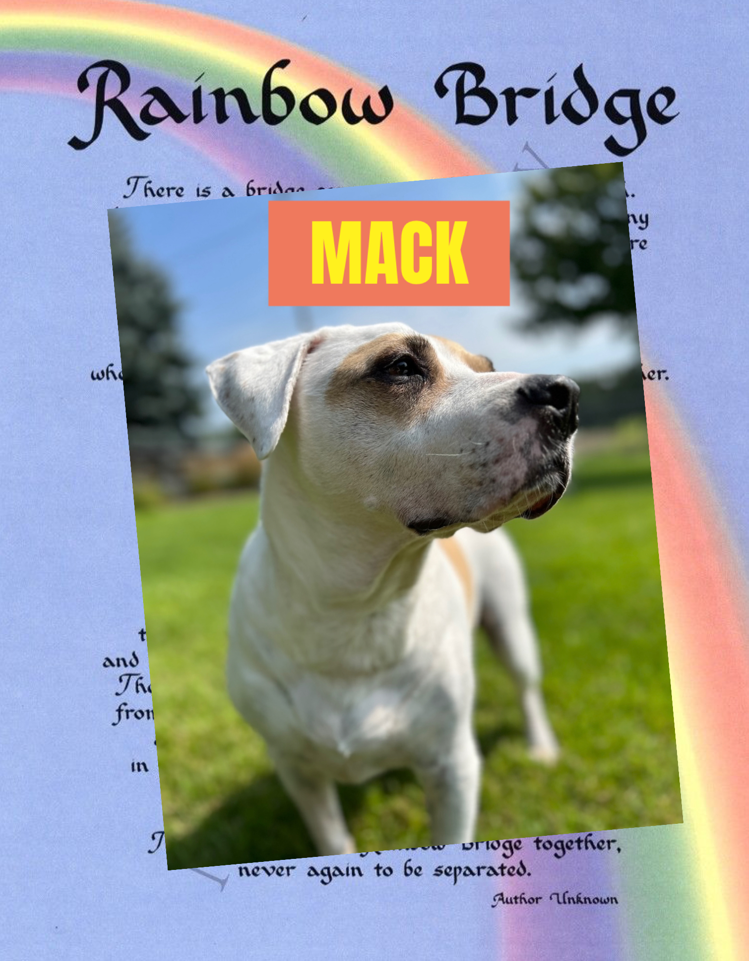 There is a bridge connecting Heaven and Earth. It is called the Rainbow Bridge because of its many colors. Just this side of the Rainbow Bridge there is a land of meadows, hills and valleys with lush green grass.